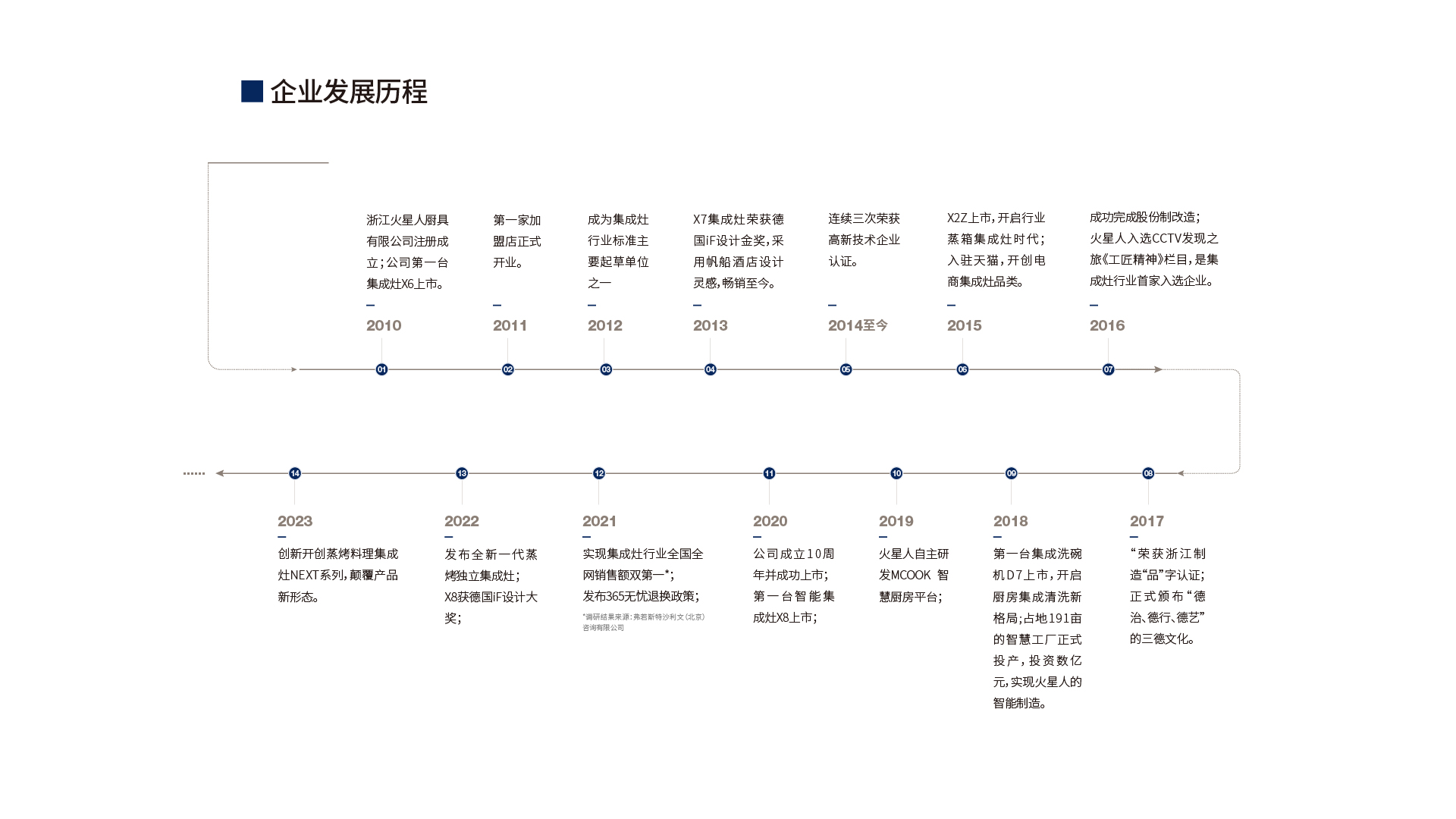 火星人坚持高端品牌引领,发展迅速上升。2020年12月31日,成立十年的火星人成功于深交所上市,上市仅半年,就跃居行业上市公司营收第一,并保持至今,火星人实现集成灶行业2021-2023年连续三年全国销售额第一*。
