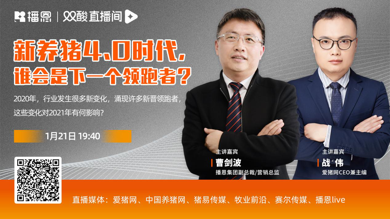 1月21日晚19:40,播恩雙酸直播間2021開年直播如期而至,這期的主題是——“養豬新4.0時代,誰會是下一個領跑者”。此次直播,特别邀請了播恩集團副總裁/營銷總監曹劍波與愛豬網CEO/主編戰偉兩位行業大咖做客直播間,以訪談式直播為方式,交流農牧話題。兩位嘉賓從2020年行業現象着手,高度凝練2020的挑戰與收獲,進而思考2021年豬業趨勢……攜農牧朋友告别2020,共同迎接2021年辛醜金牛年。