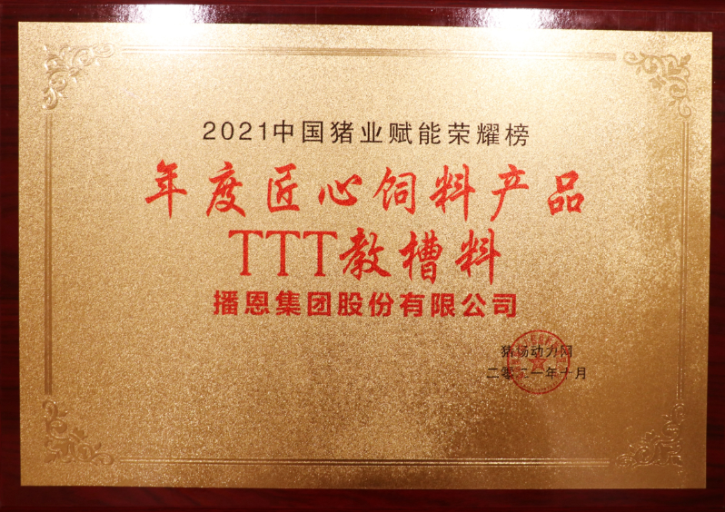 匠心産品的打造是一個漫長的過程,播恩始終不忘初心的質量堅守,精益求精的匠心鍛造,推行高品質産品和服務。此次榮膺“2021年度匠心飼料産品”獎項,不僅反映了行業與廣大客戶對産品價值的認可,也是公司持續專注技術研發、提升産品價值的結果。這也是繼2017年播恩TTT教槽料首次獲評“教保類匠心産品”後,再次獲得此項殊榮。