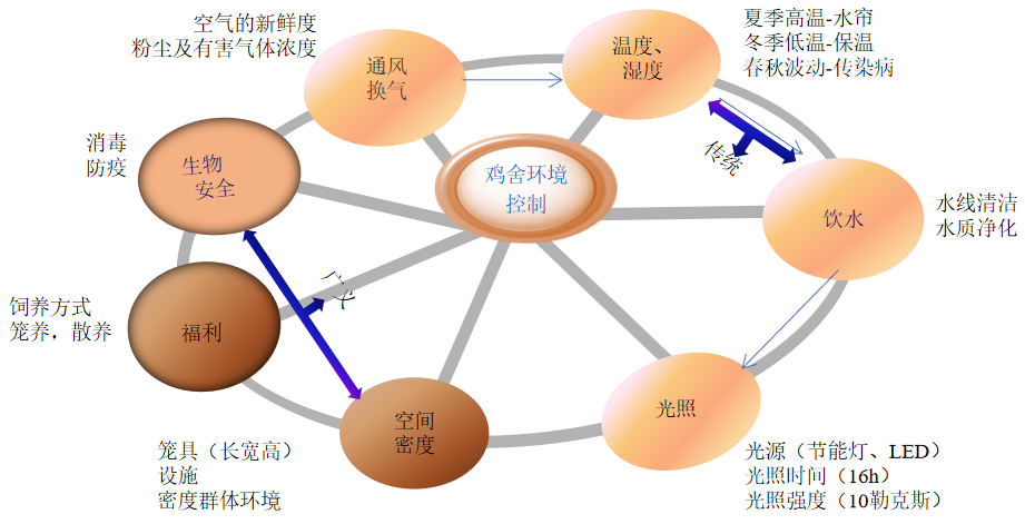 雞舍的保溫和通風措施要根據氣溫的變化而調整,在保證雞舍适宜溫度的同時,也要兼顧通風換氣。規模化雞舍一般采取最小通風模式,根據氣溫的變化及時調整風機開關數量及通風口的大小,達到既滿足換氣的需要,又實現調節溫度的目的。雞舍内二氧化碳含量不能高于0.3%,NH3濃度不超過15ppm,硫化氫濃度控制在10ppm以下。雞舍内環境控制,如圖1。