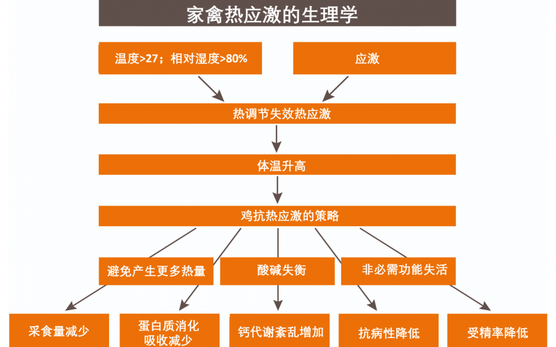 蛋雞産蛋時的最适宜溫度是18~22℃,在該溫度下能夠達到最高的産蛋效率。當溫度達到28℃以上時,蛋雞就開始表現出采食量降低,增加飲水,排出稀糞,産蛋量降低,且蛋體積變小,蛋白變稀,蛋殼變薄,軟殼蛋、破蛋數量明顯增加;當溫度持續升高,達到32℃左右時,蛋雞表現出體溫升高,張口喘息,呼吸困難,心跳加速,冠髯發绀、潮紅,肌肉震顫,易伴發急性支氣管肺炎,甚至導緻死亡。另外,蛋雞發生熱應激時,由于呼吸緊迫,呈張口喘氣狀态,張開雙翅,嚴重時隻能伏卧籠裡,無法站立,也有可能導緻死亡。一般來講,蛋雞熱應激時,籠養蛋雞最上層,且大多數是體重較大的蛋雞,往往在午間、紮堆以及應激後發生死亡。家禽熱應激生理學見圖1,熱應激對蛋雞的危害見圖2。