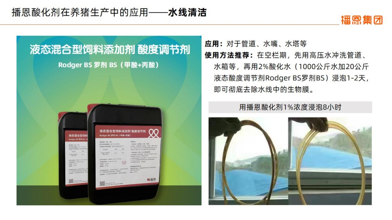 他指出,酸化劑可以降低生豬胃腸道pH值,減少大腸杆菌、沙門氏菌等緻病菌的數量。播恩集團液體酸化劑具有豐富的技術曆史沿革,特點是高效、安全、穩定、促健康等。酸化劑主要運用在豬場消毒、清潔、動物飲水添加等多方面,可有效抑菌、抗病毒,提升豬場生産性能。