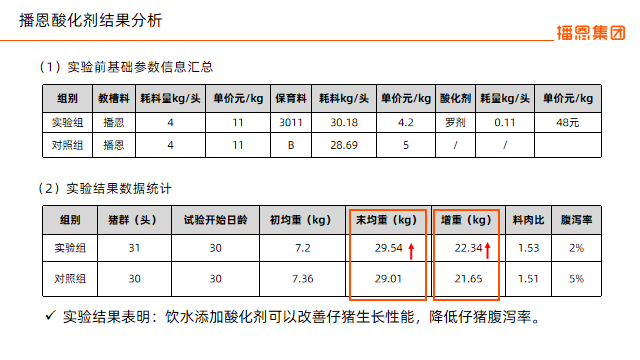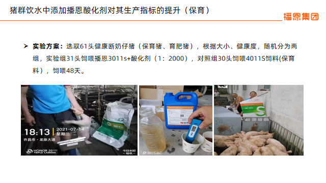 向老師還在現場展示了四組對比實證數據,從保育豬飲水酸化、懷孕母豬飲水酸化兩個角度印證液體酸化劑的作用。實驗表明,保育豬和懷孕母豬飲水使用播恩雙酸養殖模式酸化劑後,回報率大大提升。