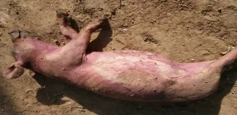 如豬隻全身皮膚出現發紅發紫現象,一般是細菌、病毒、原蟲等混合感染引起的全身性敗血症的特征。如非洲豬瘟、豬瘟、弓形體、附紅細胞體、敗血性鍊球菌等。這些疾病一般會伴發反複發燒,精神萎靡等症狀。治療一邊用瘟毒齊抗+鹽酸頭孢噻呋混合肌注,一邊肌注幹擾素,高燒者加注高免熱毒血清;飼料中添加闆清顆粒,飲水中添加綠益态+維生素C,連用5–7天,治療及時、病狀較輕者能夠挽救。