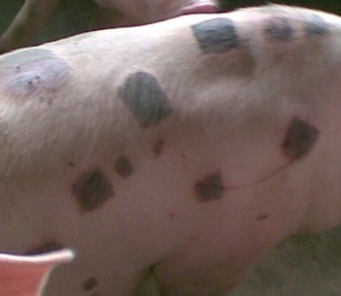 由豬丹毒杆菌感染引起出現的紫紅色斑塊,治療用鹽酸頭孢噻呋注射液肌注,連用3-5天,全群添加阿莫西林或複方阿莫西林預防,連用7-10天.