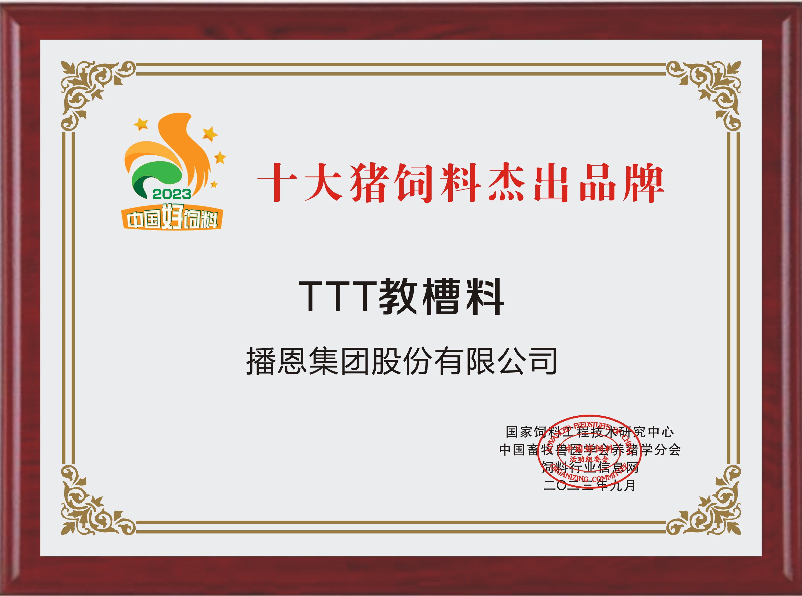 “TTT教槽料——十大豬飼料傑出品牌”獎牌