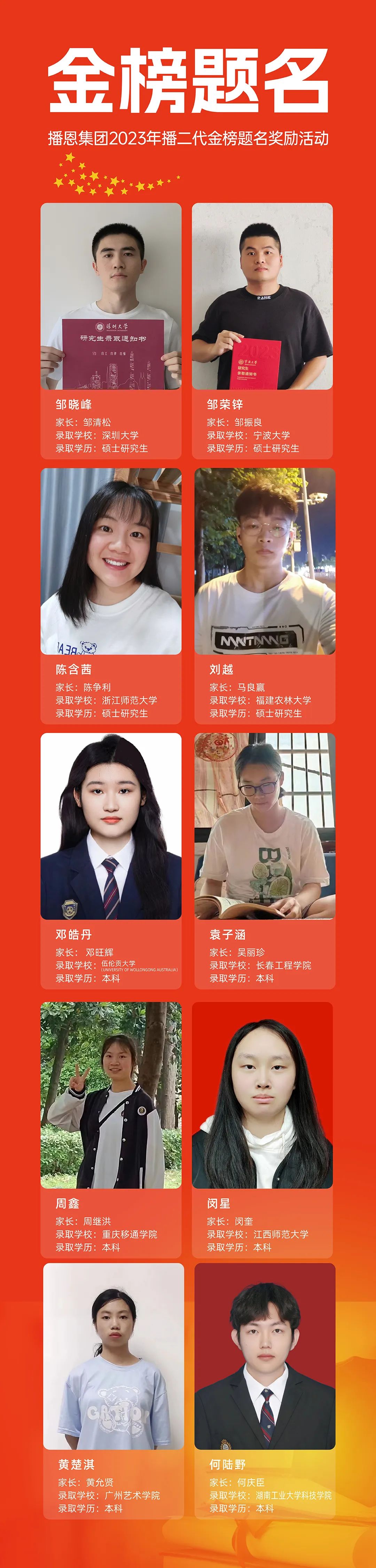 2023年集團職工子女有10人考入高校,其中碩士4人,本科6人。為鼓勵更多的“播二代們”成為有理想、有行動、有擔當的青年,同時也給職工帶來滿滿的歸屬感與榮耀感,集團除了現金獎勵外,還送上了董事長鄒新華先生的祝賀函、自著的《百煉成王—王陽明》一書、精美禮品等。我們也對其中一些具有代表性的家長進行了采訪,下面是他們的一些采訪紀實。