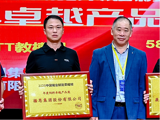 10月17日,2025中國豬業賦能大會暨賦能榮耀頒獎盛典在長沙隆重舉行。超過200位行業領導、專家、企業家等莅臨本次盛典,并共同見證了2025中國豬業賦能榮耀榜獲獎名單的公布。其中,播恩集團TTT教槽料榮獲2025年度飼料卓越産品獎。