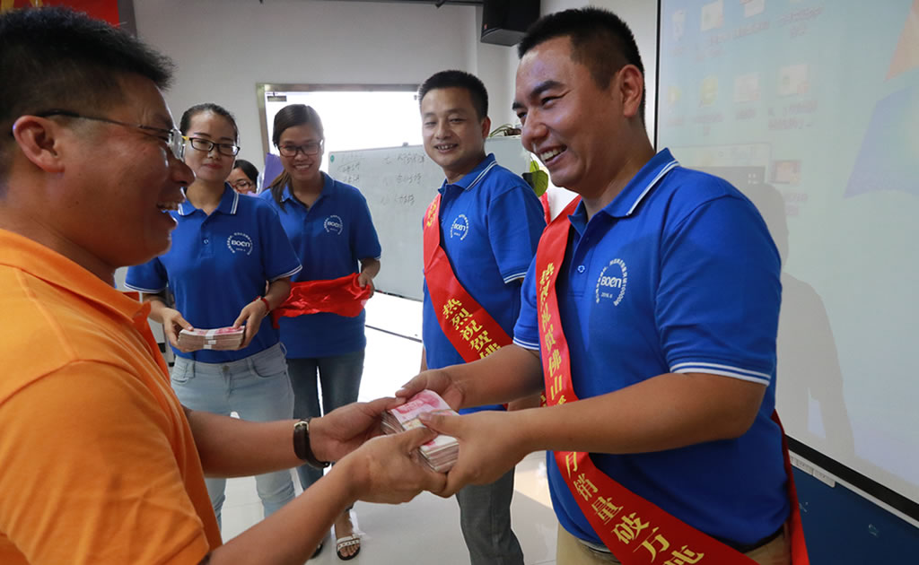 頒獎儀式上,公司對達成本次萬噸目标表現優異的省區給予了相應的表彰與獎勵。随後,曾紹鵬為獲獎省區頒獎。惠州省區、廣西大區、海南愛佑完成了月度銷量和總銷量兩項指标;肇慶省區、肇慶全價料、江門省區、粵西大區、梅州省區達成了月度目标銷量,以上8個省區均獲得了現金重獎。獲獎代表們配上授帶,接過鮮花,展示着嶄新的一疊疊人民币,整個會場充滿了歡呼聲與尖叫聲。