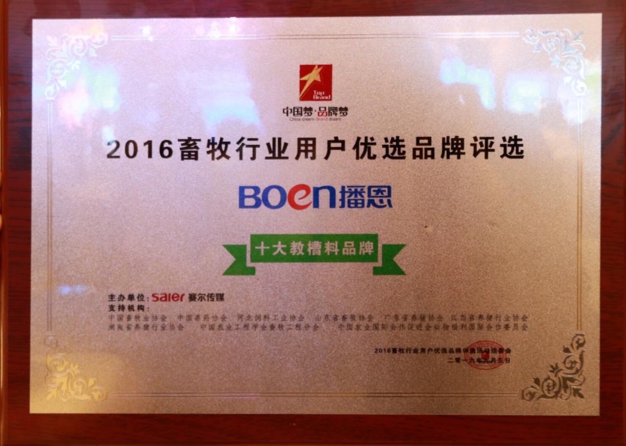 播恩集團品牌、産品得到了廣大養殖戶的進一步認可,産品綠色環保,企業高效踐行。此獎項經由消費者推薦、網絡公開投票、專家評審打分等層層篩選得出。網絡投票開始後,播恩集團旗下的“TTT”、“開心套餐”、“速八”等的口碑影響力被養殖網友們所津津樂道。播恩集團在教槽料品牌的支持投票率也一路遙遙領先,并最終經顧問專家團隊的共同評定,播恩集團榮獲“用戶優選十大教槽料品牌”。