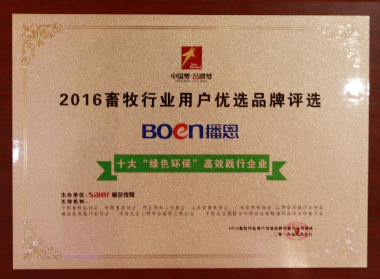 “沒有全民健康,就沒有全面小康”,2016年8月19至20日,全國衛生與健康大會在北京舉行時,習近平總書記強調:要把人民健康放在優先發展的戰略地位。其中講話中還涉及到“環境保護與食品安全”方面的重要内容。2016“健康中國”戰略的确立,對于廣大畜牧業行業從事者以及企業提出了更高、更嚴格的要求,推動健康養殖,保障食品安全我們責無旁貸,遵之則能得以更好的生存和發展。播恩集團一路走來,追求創新、綠色、環保,深入貫徹落實國家相關行業政策,并關注市場需求,不斷調整優化産品,走綠色可持續發展之路,此次榮獲“用戶優選十大“綠色環保”高效踐行企業”,和播恩集團“用我們的産品和技術,讓全球消費者享用健康美味的農産品”願景不謀而合,嚴把從農田到餐桌的每一道防線。